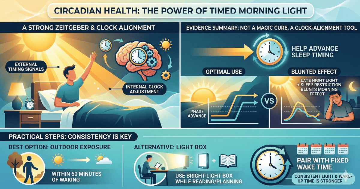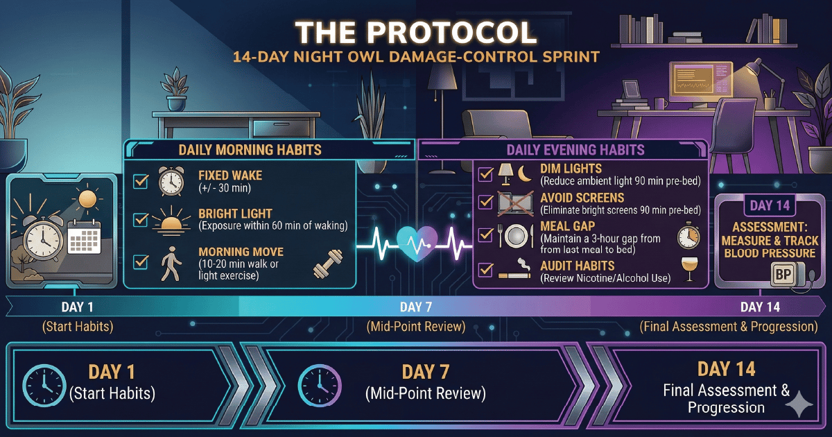 If you are a night owl, the goal is not perfection. The goal is less circadian friction: a consistent wake time, real morning light, fewer bright screens late, and a couple of measurable guardrails (like the 3-hour meal gap and BP trend).