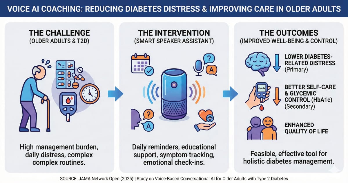 A randomized clinical trial tested a smart-speaker interactive virtual assistant for older adults with type 2 diabetes. It improved mental distress (the primary outcome) and also improved diabetes self-care measures and HbA1c over 12 weeks.