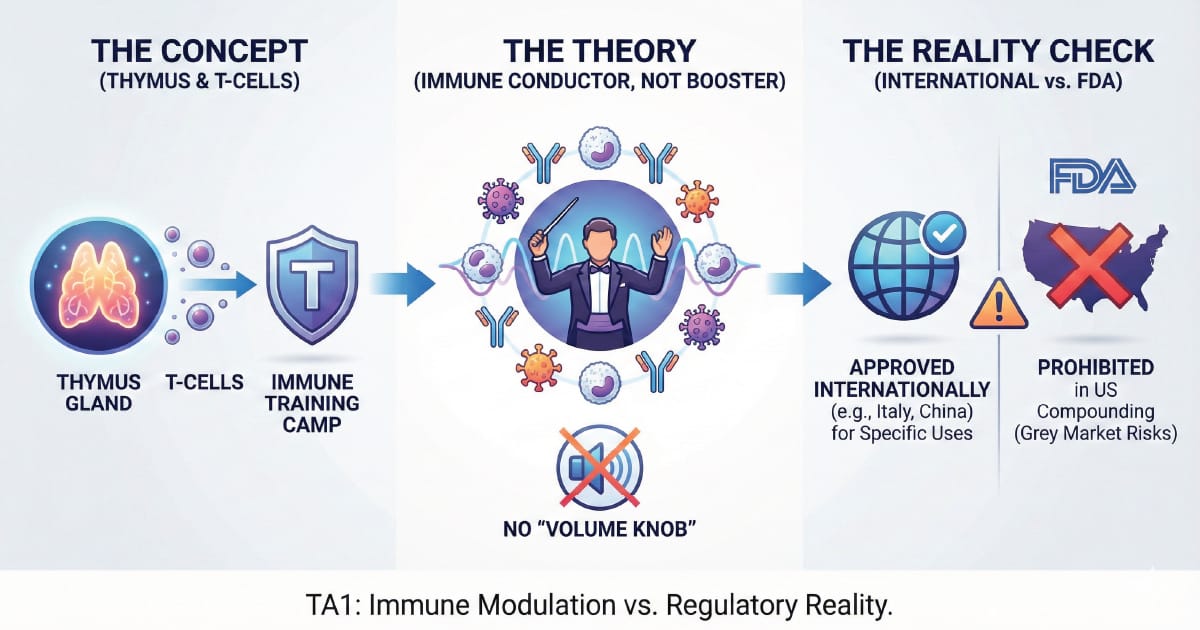 ⚠️ Disclaimer: Thymosin Alpha-1 (Tα1, thymalfasin) is not FDA-approved in the United States. Any use for "immune support," infection prevention, inflammation, recovery, or "performance/longevity" is experimental and should be treated as a monitored medical decision, not a DIY protocol. Evidence is indication-dependent, and long-term safety for off-label use in healthy people is not well established.
