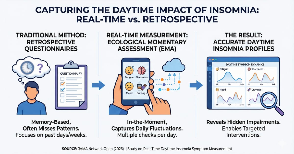 A randomized clinical trial used smartphone-based real-time check-ins (ecological momentary assessment, EMA) to measure daytime insomnia symptoms multiple times per day during insomnia pharmacotherapy.