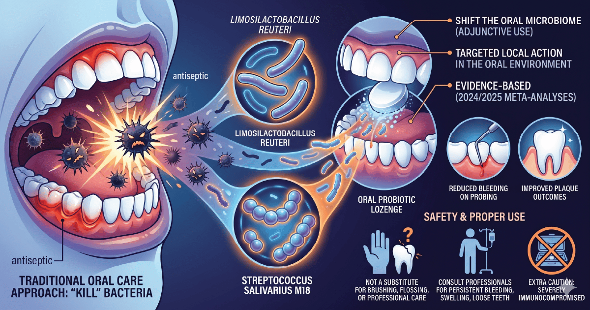 The strain family that keeps showing up most often in this literature is L. reuteri. There is also newer trial-level interest in Streptococcus salivarius M18 lozenges, which improved periodontal measures in a 2025 randomized trial.