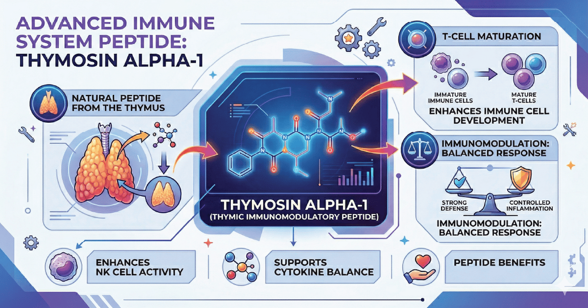 Thymosin Alpha-1, often abbreviated Talpha1 or Tα1, is a 28-amino-acid peptide originally isolated from thymic tissue and developed as an immunomodulatory agent. It has been studied across infections, immune dysfunction, vaccine response, sepsis, and some oncology-adjacent contexts. That alone makes it more serious than the average peptide being marketed into the longevity world.