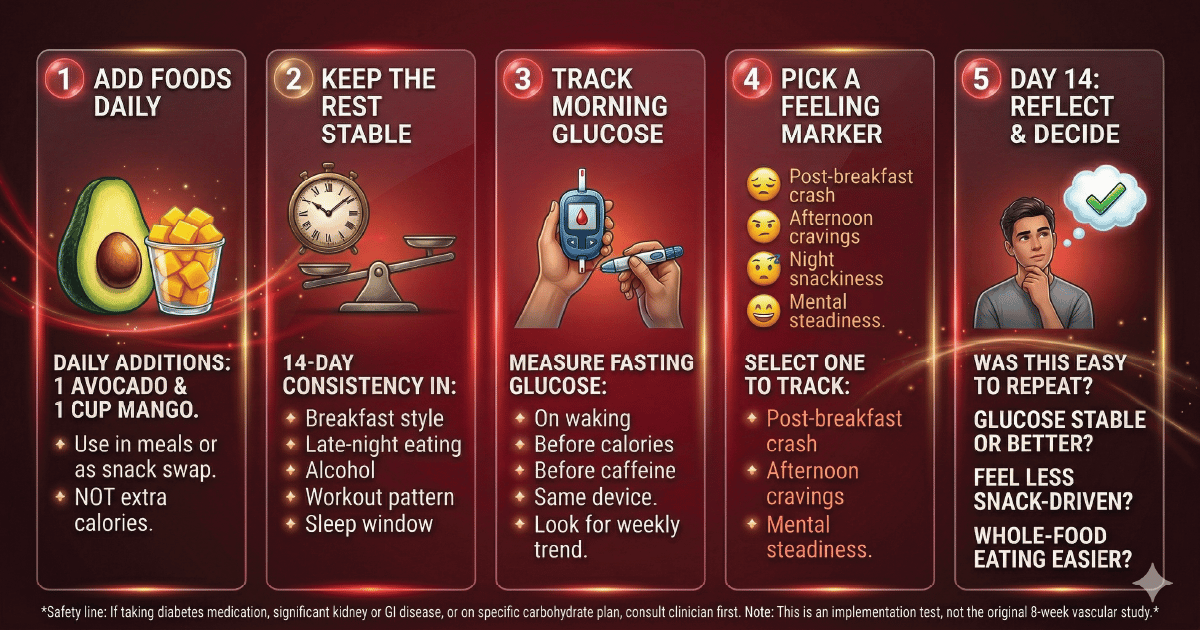 It is a field version of the study: a short, clean test to see whether you can implement the food pattern, keep the rest of your diet steady, and watch what happens to your morning glucose and daily feel. The study directly tested one avocado + one cup of mango daily for 8 weeks in adults with prediabetes. The protocol below is the practical version – lighter, shorter, and honest about what it can and cannot show.