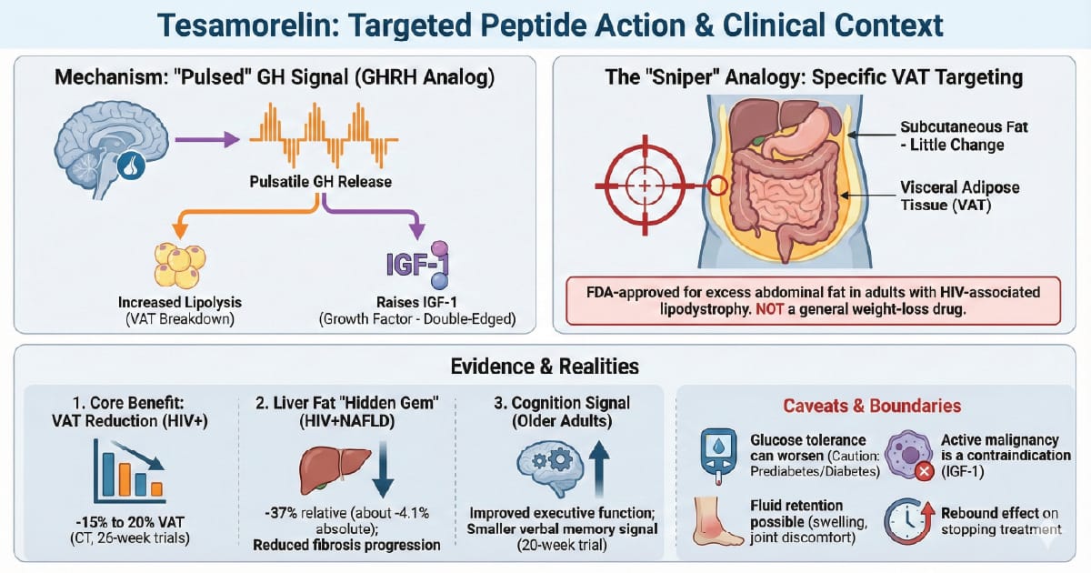 Important boundary: tesamorelin is FDA-approved to reduce excess abdominal fat in adults with HIV-associated lipodystrophy. It is not indicated for weight loss, and the long-term cardiovascular outcome story is still not settled. Off-label use exists, but the strongest data live in that HIV population.