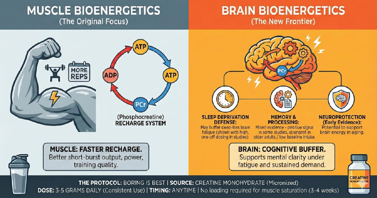 In the brain: when energy demand spikes (sleep loss, sustained mental work), creatine appears to help as a buffer during that metabolic crunch.