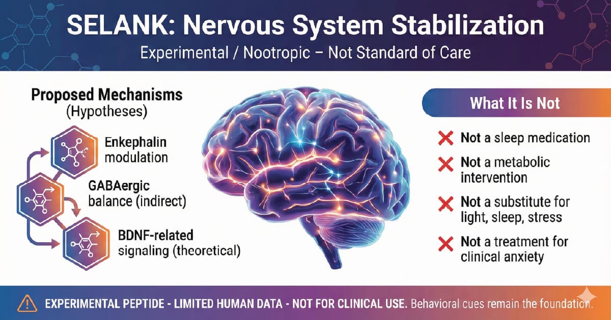 January stress is often nervous-system driven, not motivational. Selank fits the theme of this issue – nervous system stabilization – only when framed honestly as: "Here is the frontier, not the recommendation."
